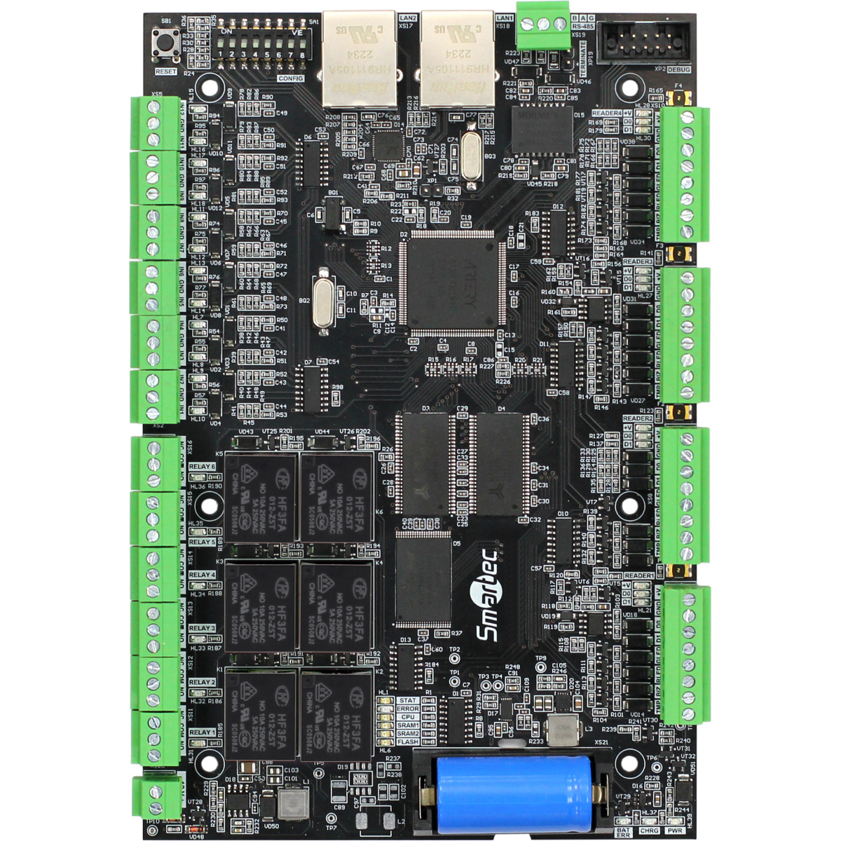 Сетевой контроллер на 4 двери (4 считывателя) без бокса подключение до 15 модулей расширения, работа под управлением ПО Timex 23.2.0 и выше TCP/IP, Wiegand 26 и 34 100000 пользователей 100000 событий 12 контролируемых входов 6 релейных выходов 2 Ethernet порта Рабочие условия 0° +55°С Питание 9-14 В DC, не более 300мА.